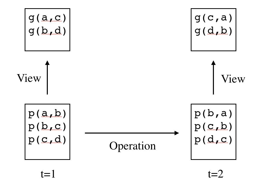 Intuitively, a view rule is something like a reverse implication. For example, the rule above says that g is true of x and z if there is a y such that p is true of x and y and p is also true of y and z. (This is the view defined in the preceding figure.) Operations are defined using operation rules. An operation rule is an expression of the form shown below. Each rule consists of (1) an action expression, (2) a double colon, (3) a literal or a conjunction of literals, (4) a double shafted forward arrow, and (5) a literal or an action expression or a conjunction of literals and action expressions. The action expression to the left of the double colon is called the head; the literals to the left of the arrow are called conditions; and the literals to its right are called effects.